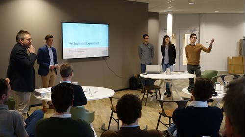 Sediment wordt al eeuwen door de rivieren aangevoerd en afgezet in de rivierbedding in de vorm van zand, klei of grind. Deze in het verleden afgezette grondstoffen worden nu gewonnen. Als de door de rivier overstroomde uitwaarden weer droogvallen, zie je in de uiterwaarden nieuw achtergelaten sediment. Als dat proces een handje geholpen zou worden door het gebied op een dusdanige manier in te richten zodat het optimaal sedimenteert, zou er dan na een aantal jaar opnieuw zand of klei gewonnen kunnen worden? Dat was de hoofdvraag waarmee de studenten aan de slag gingen. De studenten hebben onderzocht hoe sedimentatie verloopt, of dat gestuurd zou kunnen worden en hoe die kennis gebruikt zou kunnen worden bij de inrichting van een gebied om een sedimentatiemotor te bouwen.